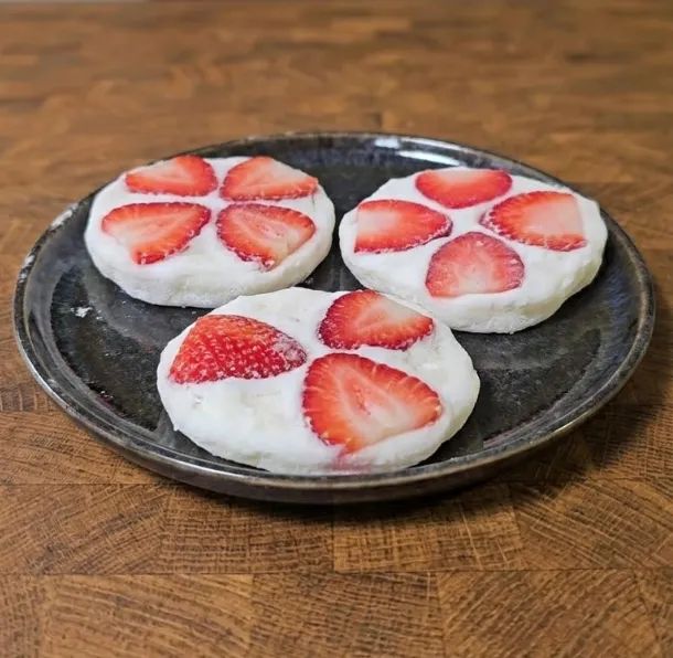 שלב 4: קשטו כל עיגול בפרוסות תותים.